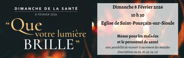 Dimanche de la santé - Messe pour les malades et les soignants Dimanche 8 Février – 10 h 30 – Saint-Pourçain-sur-Sioule Ce Dimanche 8 Février sera la journée mondiale de la santé. 0 A cette occasion, nous prierons pour tous les malades et les soignants de notre paroisse au cours...