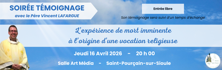 Un témoignage qui bouleverse : rencontre avec le Père Vincent Lafargue Jeudi 16 Avril 2026 - 20 h 00 - Saint-Pourçain-sur-Sioule La paroisse Saint-Vincent vous convie à une soirée de témoignage hors du commun avec le Père Vincent Lafargue ! Cette rencontre aura lieu le Jeudi 16 Avril prochain...
