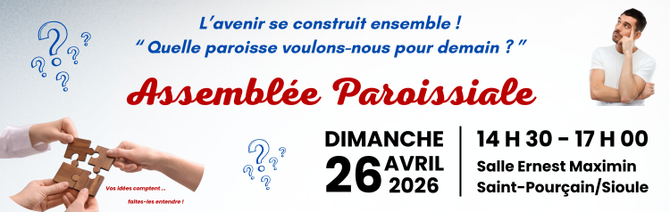 MESSE EN FAMILLE ET DES JEUNES Dimanche 8 Mars 2026 - 10 h 30 - Eglise de Saint-Pourçain-sur-Sioule La prochaine messe en famille et des jeunes aura lieu ce Dimanche 8 Mars 2026 à 10 h 30 en l'église Sainte-Croix de Saint-Pourçain-sur-Sioule. Tu souhaites devenir acteur de la messe ? Viens...