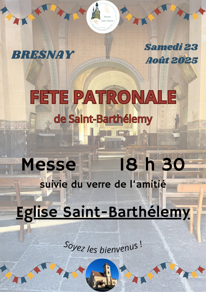 A l’occasion de la Saint-Barthélemy, une messe sera célébrée le Samedi 23 Août 2025 à 18 h 30 en l’église Saint-Barthélemy de Bresnay.