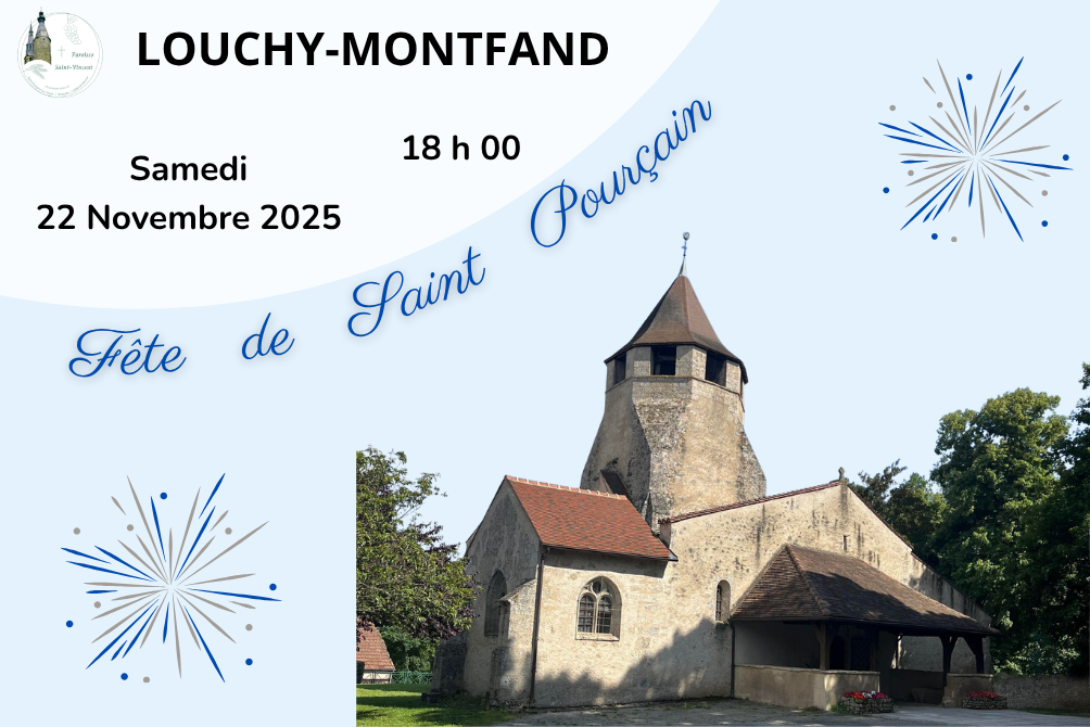 Fête patronale - Saint Pourçain - Louchy-Montfand Samedi 22 Novembre 2025 - 18 h 00 Une messe sera célébrée ce Samedi 22 Novembre à 18 h 00 en l'église Saint-Pourçain de Louchy-Montfand à l'occasion de la fête patronale. La célébration eucharistique sera suivie d'un vin chaud sous le porche....Lire la suite