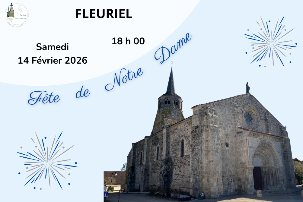 Fête patronale - Notre-Dame - Fleuriel Samedi 14 Février 2026 - 18 h 00 Une messe sera célébrée ce Samedi 14 Février à 18 h 00 en l’église Notre-Dame de Fleuriel à l’occasion de la fête patronale. Nous vous espérons nombreux pour cette occasion.