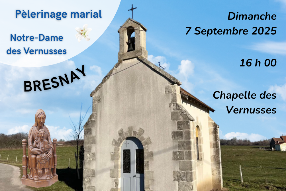 Pèlerinage marial à Notre-Dame des Vernusses Dimanche 7 Septembre 2025 - 16 h 00 - Chapelle des Vernusses à Bresnay Chaque premier Dimanche de Septembre a lieu un pèlerinage à Notre-Dame des Vernusses sur la commune de Bresnay. Cette année, il se tiendra le Dimanche 7 Septembre 2025 à...Lire la suite