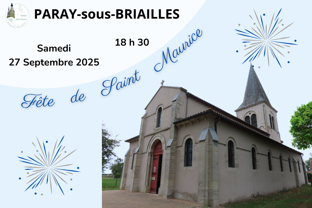 Fête patronale - Saint Maurice - Paray-sous-Briailles Samedi 27 Septembre 2025 - 18 h 30 Une messe sera célébrée ce Samedi 27 Septembre à 18 h 30 en l'église Saint-Maurice de Paray-sous-Briailles à l'occasion de la fête patronale. La célébration eucharistique sera suivie du verre de l'amitié. Nous...Lire la suite