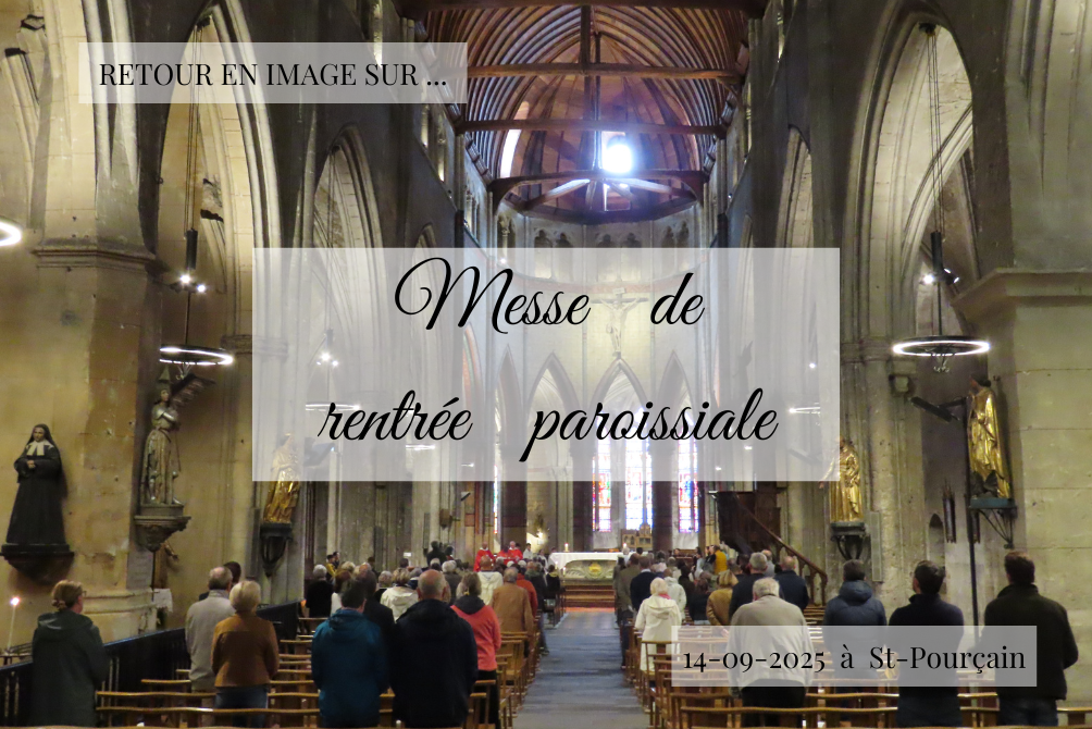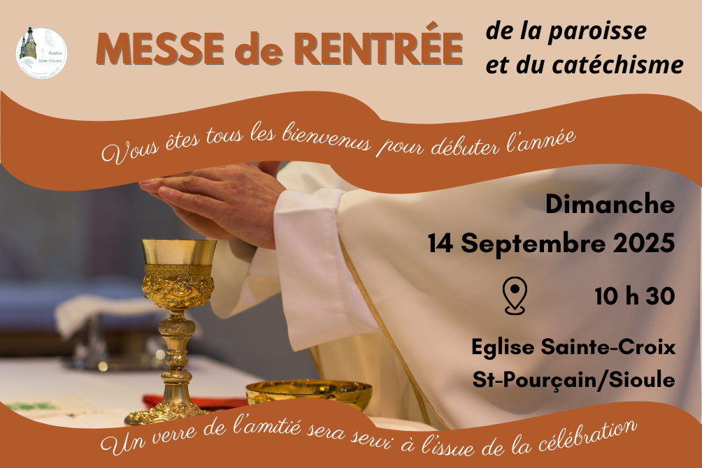 Messe de rentrée paroissiale Dimanche 14 Septembre 2025 - 10 h 30 - Saint-Pourçain-sur-Sioule Le mois de Septembre est aussi la rentrée de la paroisse ! Nous vous invitons à la messe de rentrée paroissiale et du catéchisme le Dimanche 14 Septembre prochain à 10 h 30 en l'église...Lire la suite