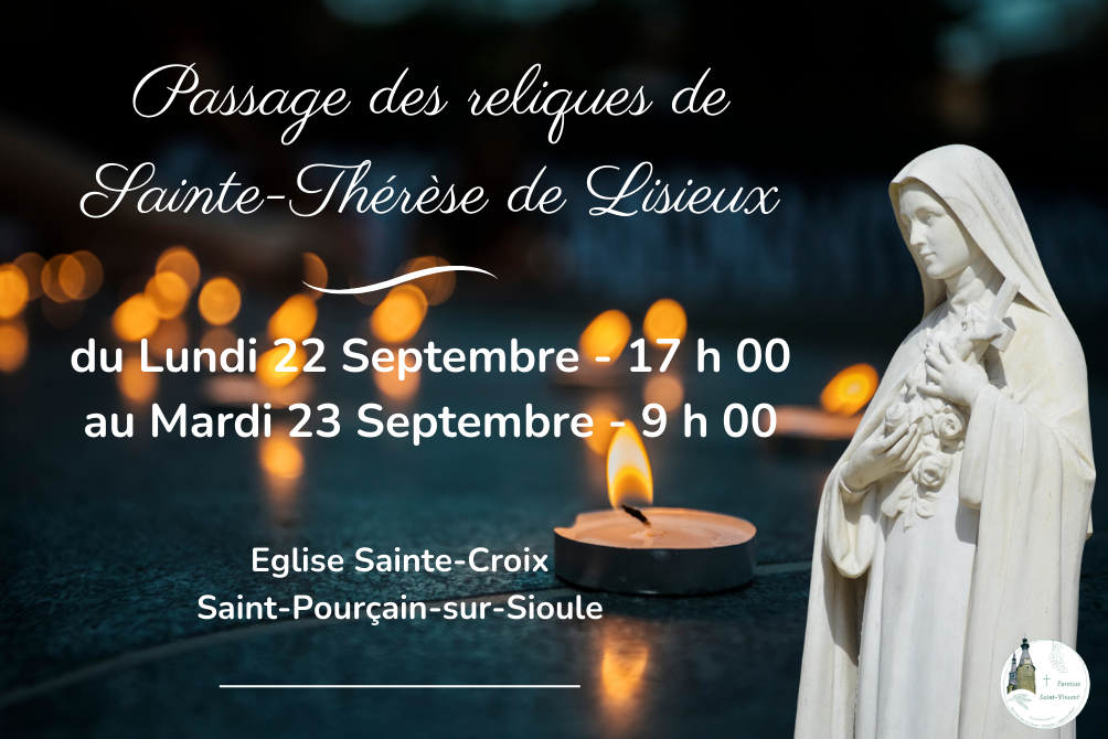 Passage des reliques de Sainte-Thérèse de Lisieux du Lundi 22 Septembre - 17 h 00 au Mardi 23 Septembre 2025 - 9 h 00 - Eglise de Saint-Pourçain-sur-Sioule Nous accueillerons les reliques de Sainte-Thérèse de Lisieux au sein de notre paroisse Saint-Vincent du Lundi 22 Septembre - 17 h 00 ...Lire la suite