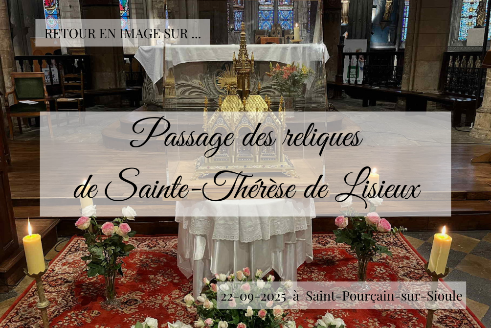 Passage des reliques de Sainte-Thérèse de Lisieux Lundi 22 Septembre 2025 – Saint-Pourçain-sur-Sioule Les reliques de Sainte-Thérèse de Lisieux ont franchi la porte de l’église de Saint-Pourçain-sur-Sioule le Lundi 22 Septembre dernier en fin d'après-midi pour s'y arrêter quelques heures. Pour cette occasion inédite, un programme bien chargé a...Lire la suite