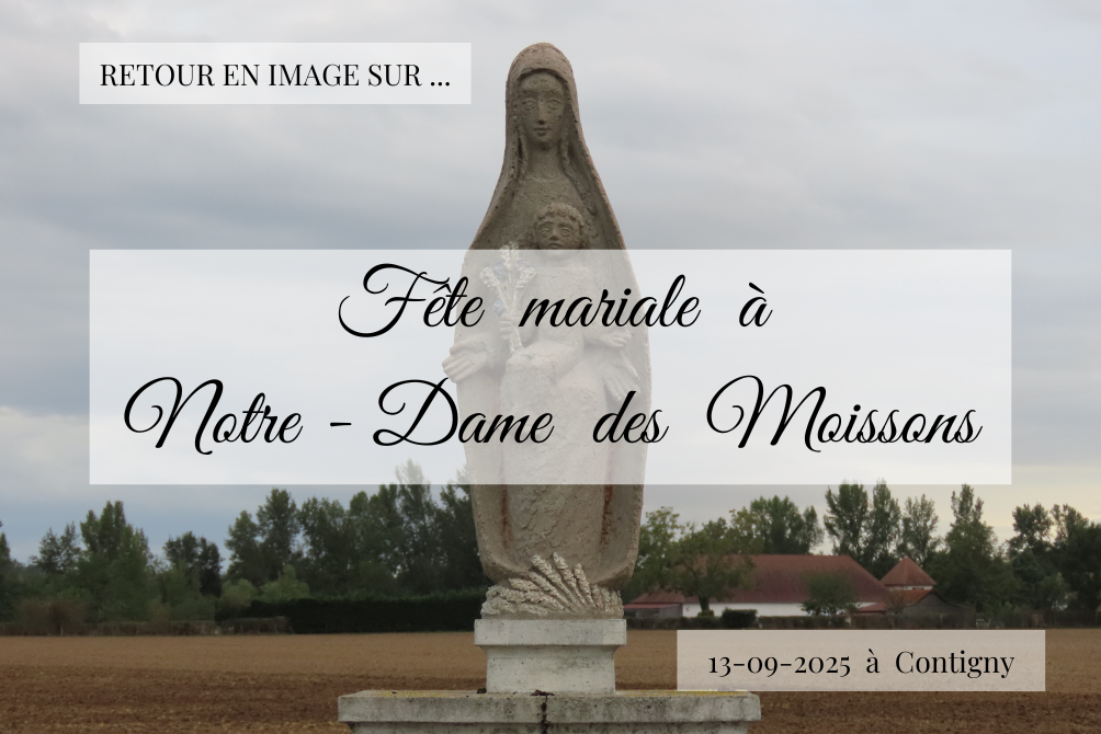 Fête mariale à Notre-Dame des Moissons Samedi 13 Septembre 2025 - 18 h 30 - Contigny Comme la tradition le souhaite, le samedi suivant le 8 Septembre, une messe a été célébrée en plein air à Notre-Dame des Moissons pour honorer cette vierge. Cette célébration eucharistique a eu lieu...Lire la suite
