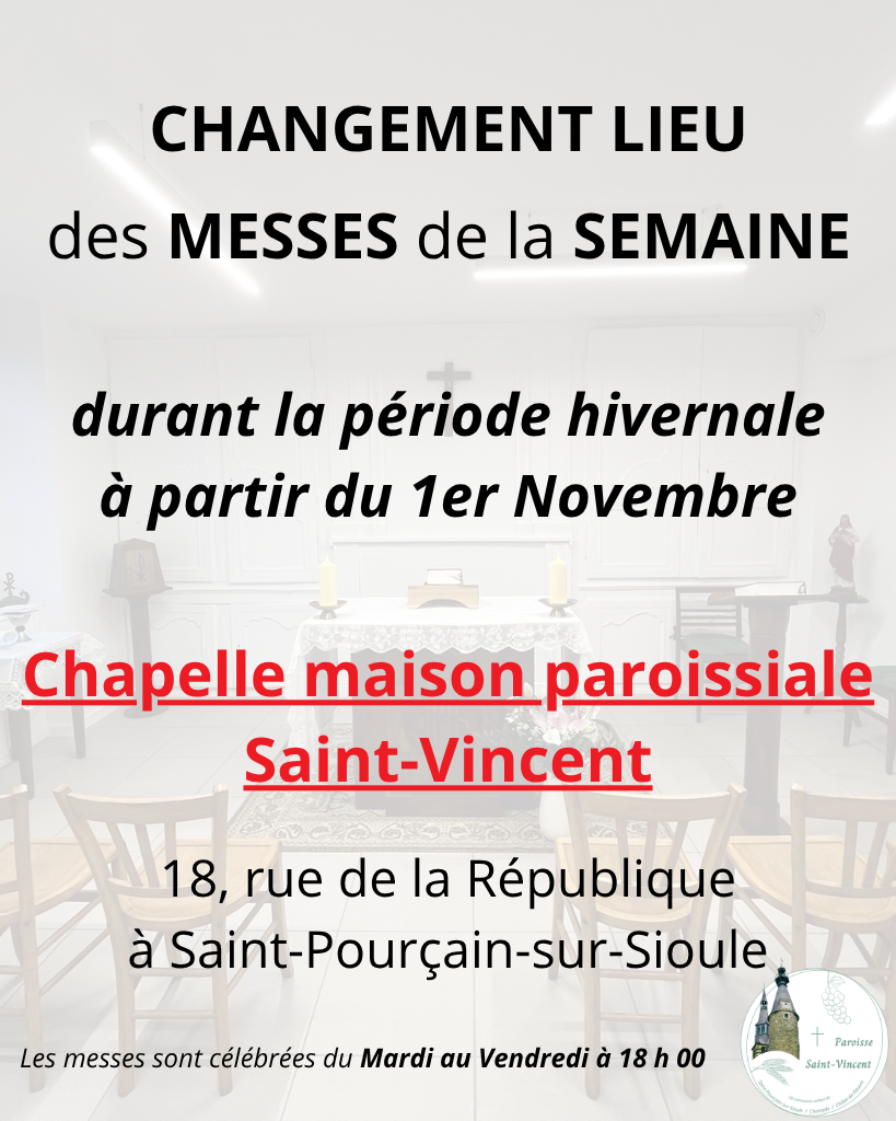 Durant la période hivernale, à compter du Samedi 1 Novembre 2025, les messes de la semaine seront célébrées à la chapelle de la maison paroissiale Saint-Vincent.