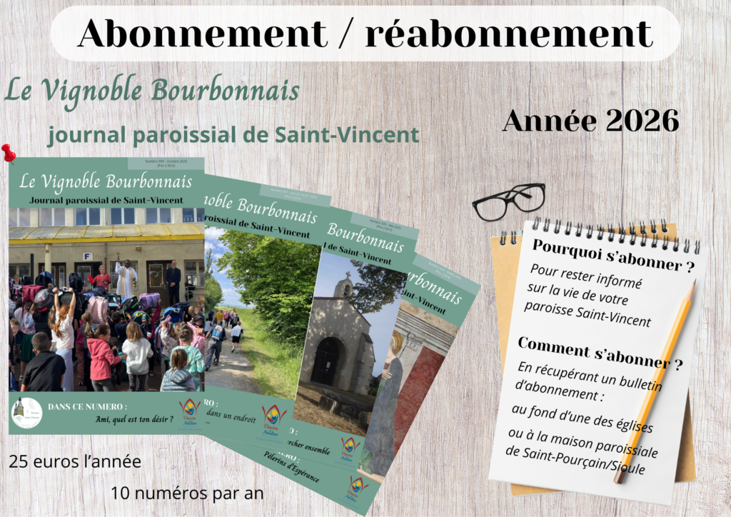 Si vous n’êtes pas encore abonné ou réabonné, il est encore temps de le faire en envoyant votre coupon accompagné de votre règlement à la Paroisse Saint-Vincent.